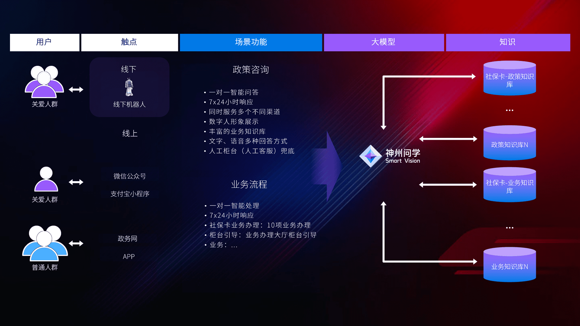 • 线上线下全覆盖:线上提供微信公众号、、、支付宝小程序、、、、政务网、、、、app多种渠道,,,与线下机器人形成完整服务体系。。