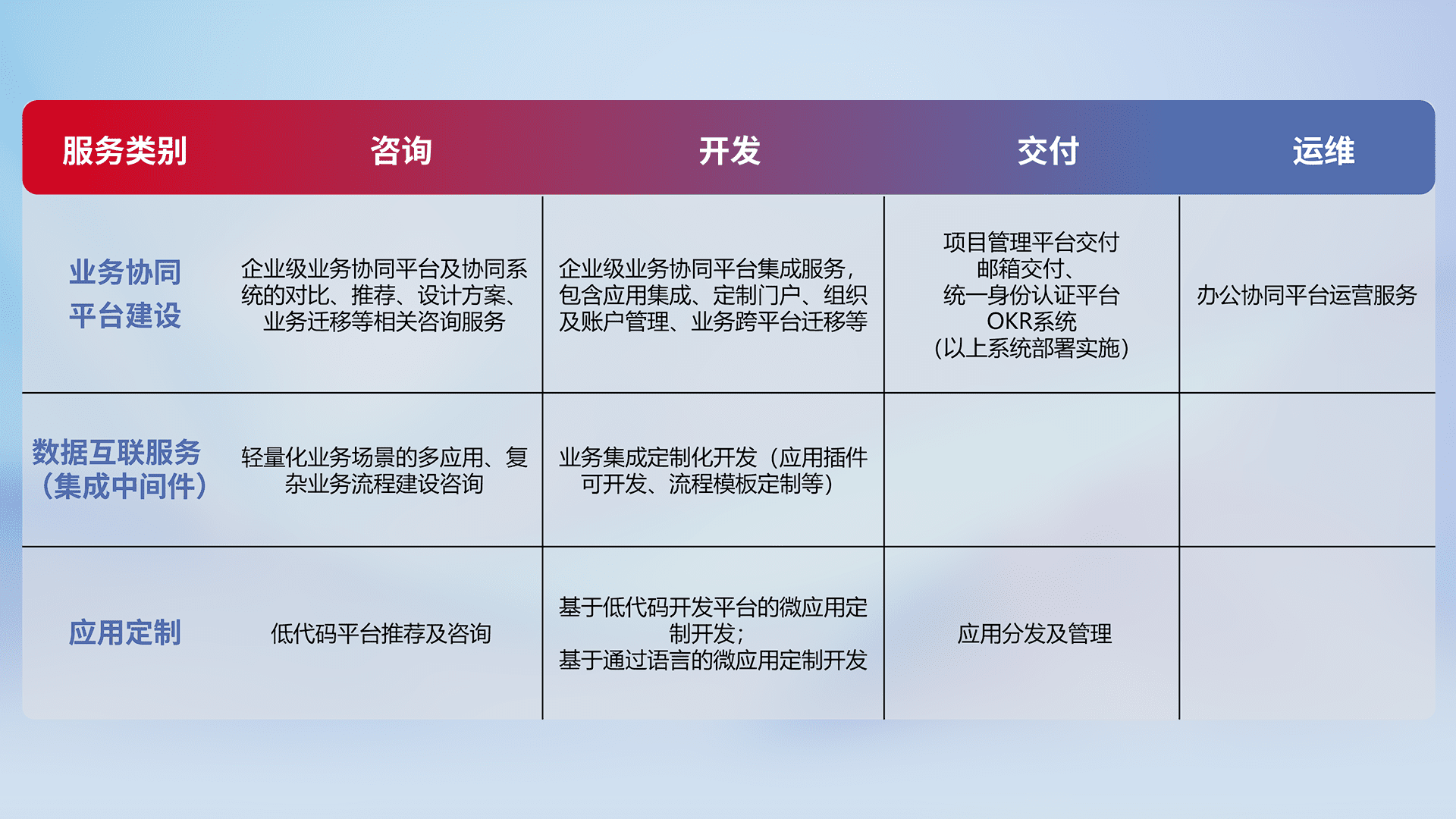 针对钉钉、、企微、、、、IDaas等平台级产品提供产品的规划、、方案、、、、交付、、、定制化开发等服务,,,实现如统一协同办公、、、智能客户服务、、、混合会议管理、、、、智能数据查询、、等业务场景,,,实现数字化转型。。。