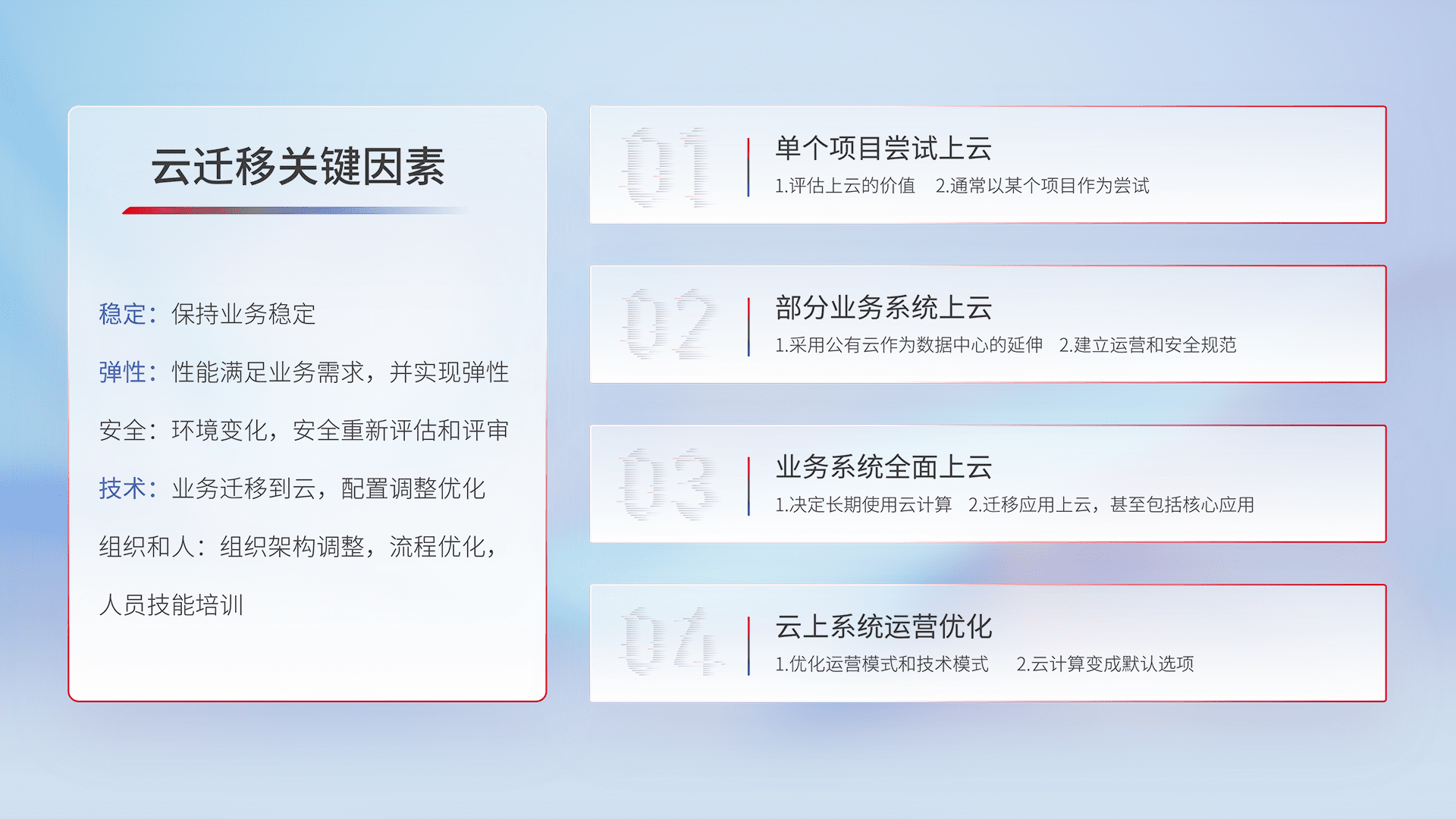 结合实际业务,,,,从规划设计、、、云平台选型、、、云原生改造、、数据迁移、、集成交付,,迁移全过程为客户识别最佳上云路径,,,做好风险识别管理,,,设计网络架构、、身份权限、、、安全审计合规、、、、操作审计、、日志审计、、、、监控告警策略、、、、多站点容灾设计等,,,对云上基础设施进行整体规划,,提升IT治理水平,,,以满足弹性、、、、高可用、、、、高性能的需求。。。。