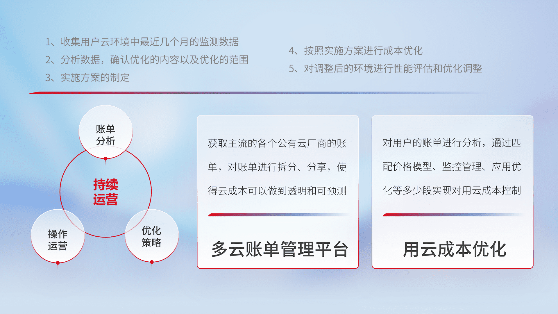 通过多云纳管,,以统一的资源数据模型把客户的云资源进行抽象和封装,,,,进而实现对多云资源的统一操作,,,保障云资源管理的可靠性、、、稳定性与可用性。。量身定制化运维内容,,配置、、、、开发运维、、补丁管理、、备份、、监控、、、、认证和访问管理、、、审计和日常巡检等,,,保障在用云过程中的可靠度,,,,稳定度以及高可用率。。