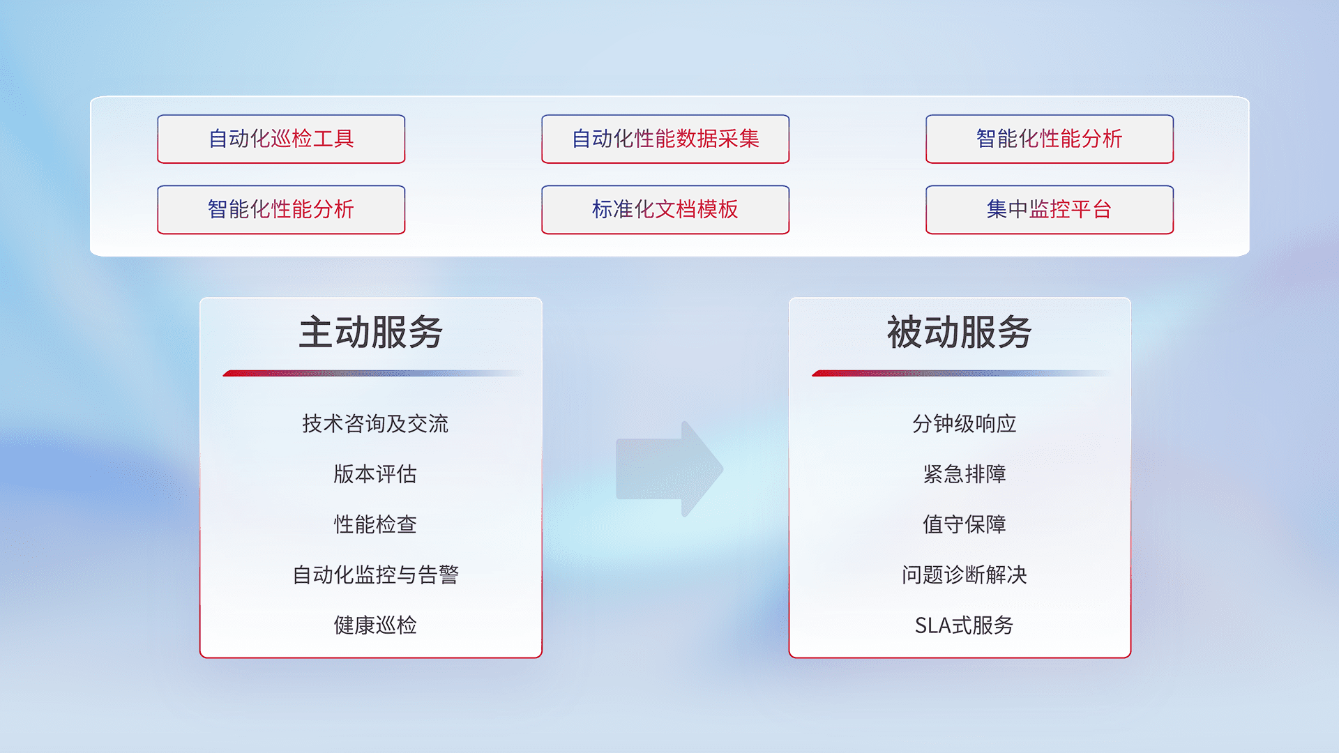 智能化工具和标准化文档,,保障服务质量,,,,提供主动服务(包含技术咨询、、、版本评估、、、性能检查、、自动化监控与告警、、、、健康巡检)和被动服务包含(分钟级响应、、、紧急排障、、、值守保障、、问题诊断解决、、、SLA服务)。。。。